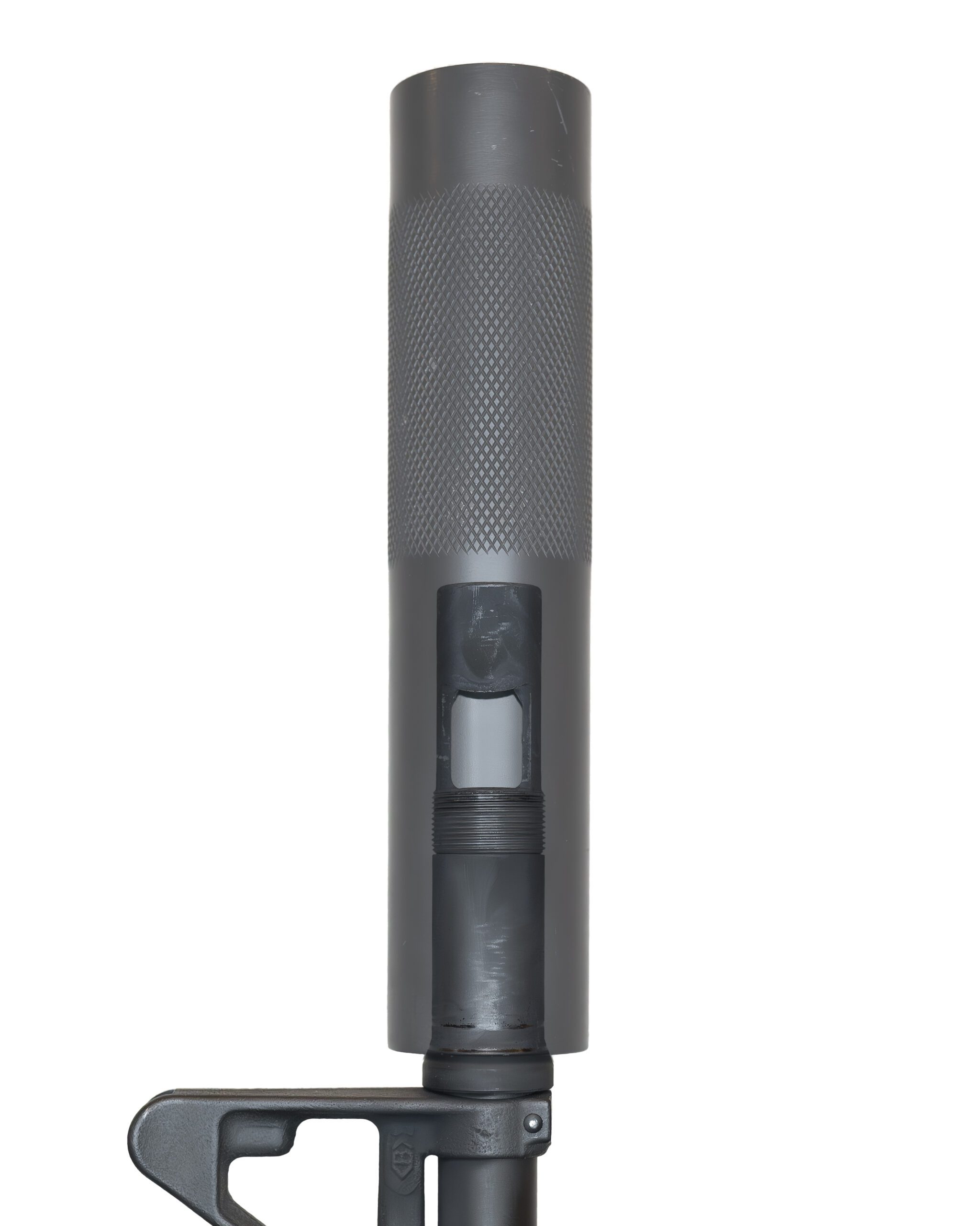 Long: This collar is primarily used to mount the M4 suppressor on a 14.5″ FSB barrel. While there were many early M4 collars used, the 3-piece long collar became the primary design used to mount AE suppressors on FSB rifles. It can also be used on most M16 20″ barrels with rifle gas and FSB.