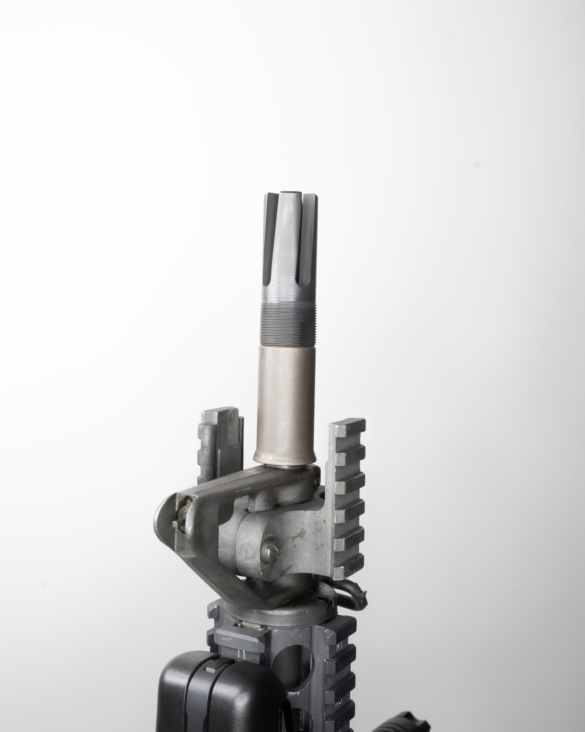 Further down the barrel is the CanSOF short collar. Many people will see the mount and assume it is one piece with the flash hider, but in fact they are two separate pieces. The collar sleeves over a .615″ barrel and is secured against the FSB when the flash hider is installed. The collar actually extends slightly past the shoulder of the barrel creating a new surface for the flash hider to push up against. It is important to note that this only works with the removal of the bayonet lug from the FSB.