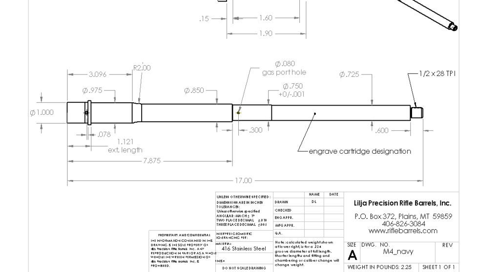Lilja often lists these M4 barrels as 17″. However, this is because they measured from the barrel extension to the muzzle. That is not the industry standard. Today, barrels are measured from the bolt face to the muzzle. When measured this way, the Lilja M4 barrel comes out to 16.5″.